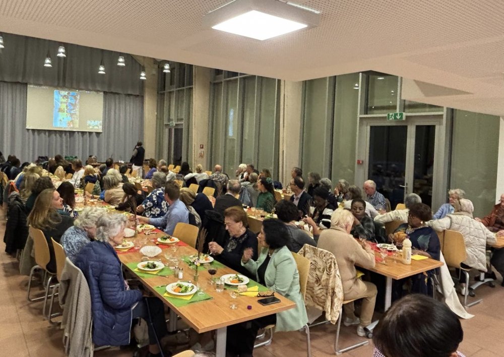 Le 8 octobre dernier, 80 convives se sont réunis à la salle paroissiale St-Loup de Versoix pour un repas de soutien en faveur de l'antenne genevoise de l'Association Enfance Jeunesse Intègre de Houndé, au centre ouest du Burkina Faso. Pendant l'apéritif, les convives ont pu entendre les explications du Père Benoît, présent providentiellement. Ils ont pu voir des images de l'école située à 7000 kilomètres, toutefois si proche des cœurs. Un contact vidéo a pu être établi avec les enfants de l'école et leur monitrice, Emilie Zoundi. Il régnait une ambiance très chaleureuse grâce à la chorale africaine et aux diverses activités proposées. Une tombola et la vente d'articles artisanaux et de nourriture burkinabè ont augmenté le bénéfice de la soirée qui s'est monté à un peu plus de 3000 CHF. La somme sera intégralement versée à l'association AEJI. Elle contribuera à enrichir la nourriture des enfants, à réaliser un couvert ombragé pour les récréations et à organiser des camps de reboisement. Une pierre de plus à l'édifice de solidarité entre Versoix et Houndé. Un grand merci à toutes les personnes qui ont contribué au succès de cette soirée, tant les volontaires que les convives. Photo fournie par les organisateurs : ambiance conviviale dans la salle pendant le repas auteur : Anne Lise Berger-Bapst