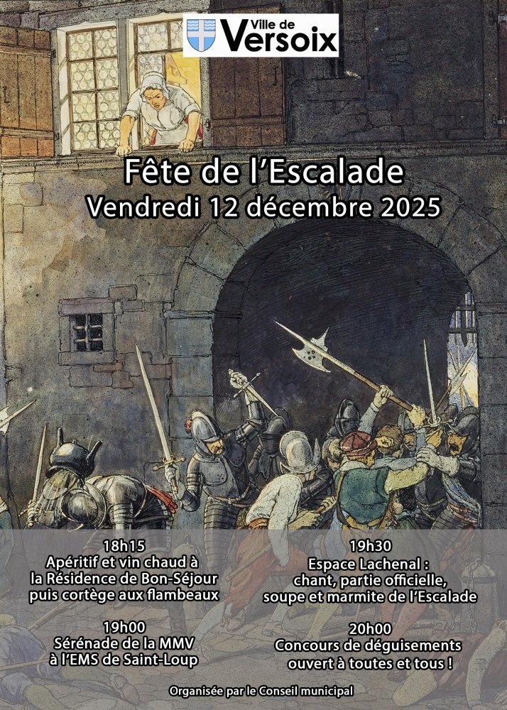 Le Conseil municipal de la Ville de Versoix a le plaisir de vous convier à la fête de l’Escalade qui se déroulera le vendredi 12 décembre. Préparez-vous à plonger dans l’ambiance historique, conviviale et festive de cette célébration genevoise emblématique. La soirée débutera à 18h15 par un apéritif et du vin chaud à la Résidence de Bon-Séjour, suivi du cortège aux flambeaux. À 19h00, la Musique Municipale de Versoix donnera une sérénade à l’EMS de Saint-Loup puis, dès 19h30, la fête se poursuivra à l’espace Lachenal avec les chants, la partie officielle, la soupe et la marmite, pour faire place au concours de déguisements à 20h00 ! Bienvenue auteur : Versoix Mairie de Versoix