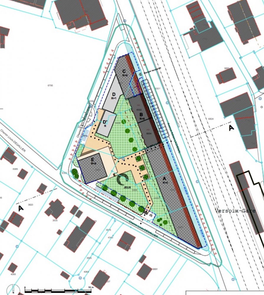 La densification de ce triangle a été jugée excessive : une barre de 7 étages sur rez et une « tour » de 9 étages sur rez, prévues dans ce PLQ n’ont donc pas trouvé place dans ce fameux triangle bordé par l’avenue Adrien-Lachenal, le chemin Louis-Dégallier et le chemin Tilia longeant le Cimetière de Versoix. De plus, ce quartier est au cœur des nuisances, entre la gare et son trafic ferroviaire et couvert par le trafic aérien qui, malheureusement, échappe encore à toute mesure visant à limiter raisonnablement sa densification au mépris du bien-être des habitants et de la planète !