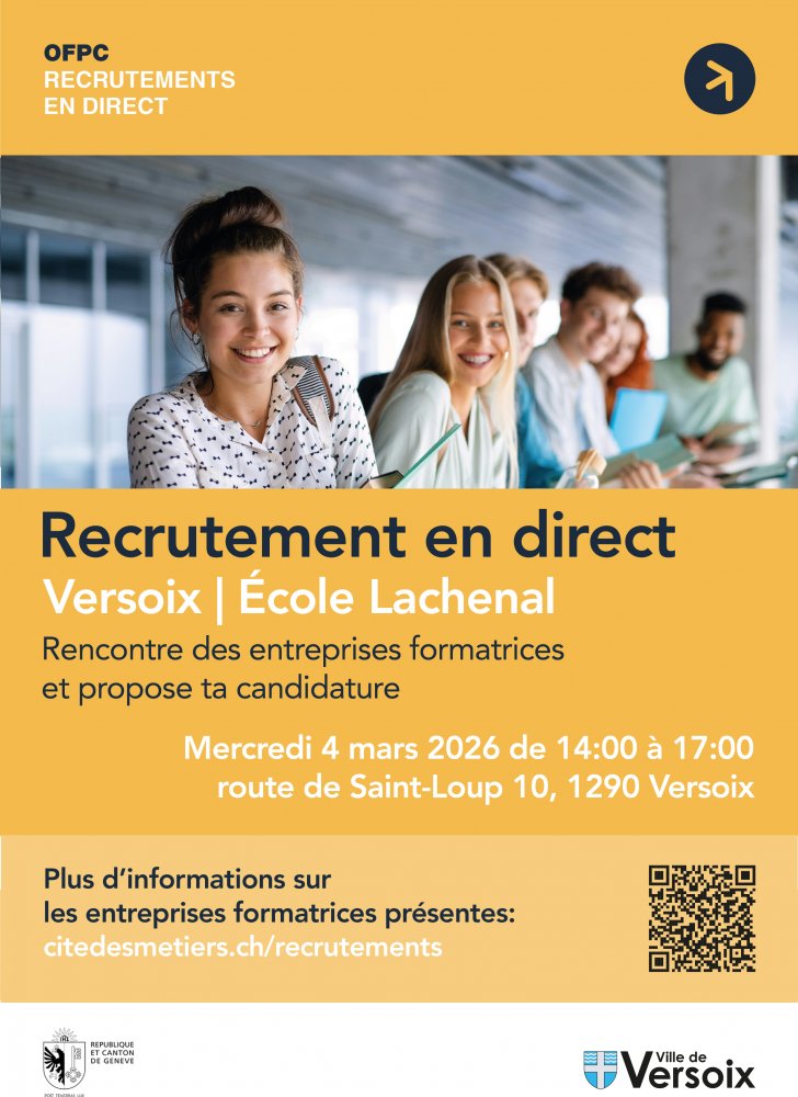 L’Office pour l’orientation, la formation professionnelle et continue (OFPC) et la Ville de Versoix organisent un recrutement en direct le mercredi 4 mars 2026, de 14h à 17h, à l’école Lachenal. Très attendu par les jeunes, ce dispositif favorise la rencontre entre les personnes intéressées par l’apprentissage et les entreprises formatrices. Lors de courts entretiens, les recruteurs présentent les exigences de leurs métiers, tandis que les candidats peuvent poser leurs questions, faire valoir leur motivation et présenter leur dossier. Il s’agit d’un premier contact sans engagement pouvant toutefois s’avérer décisif pour l’avenir professionnel. auteur : Versoix Mairie de Versoix