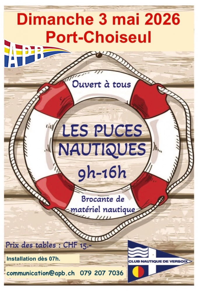 En collaboration entre le CNV et l’APB, les fameuses Puces Nautiques à Port-Choiseul Pour les navigateurs de la région, c’est l’occasion idéale pour se séparer du matériel nautique devenu inutile ou, au contraire, de dénicher la pièce d’accastillage ou une voile qui manque encore à bord. De bonnes affaires à faire dans l’ambiance sympathique du port. Vous trouverez sur le site cnv.ch ou apb.ch la fiche qui vous permettra d’inscrire votre matériel nautique à vendre ou à donner. Pour les chantiers navals et les Ship-Shops de la région, les associations et les professionnels (ou les navigateurs qui ont davantage de matériel à proposer), ils réserveront directement une table (15.-) à cet effet, auprès des organisateurs. Ils assureront eux-mêmes leur stand. Nous vous donnons donc rendez-vous le dimanche 3 mai, pour partager ce moment sympathique. Restaurant et buvette seront ouverts. Bienvenue ! Renseignements, inscriptions, tables : auteur : Pierre Dupanloup