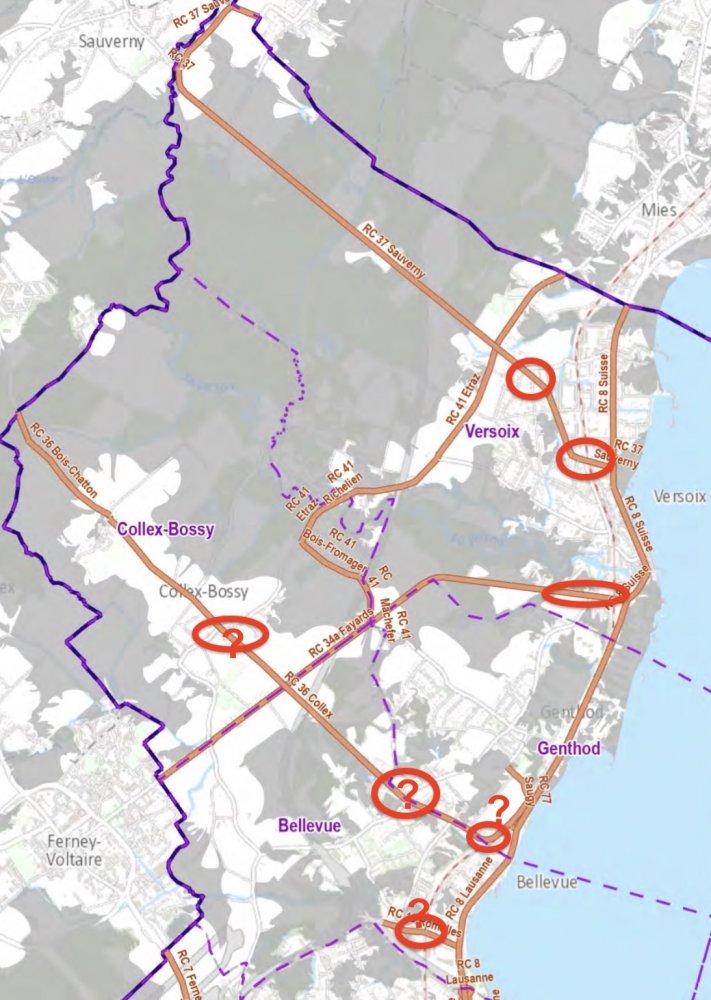 Dès 2025 de nombreuses plaintes ont été transmises tant aux autorités de Versoix qu’aux instances cantonales provenant des zones marquées d’un cercle rouge sur la carte : une pétition avec une soixantaine de signatures réclamant un peu de sécurité le long de la route des Fayards, qui ne possède que 4 passages pour piétons, pour plus de 1 km de route bordée d’habitations. Une motion Motion M23 déposée au CM en novembre 2023 n’ont pas reçu d’autres réponses que celle prétendant que le Canton souhaitait achever la période test, soit en avril 2026, avant de reconsidérer une éventuelle extension de la zone d’exception ! Pourtant il y a vraiment danger ! Des journaux en ont fait écho, la TdG, la Ville de Versoix, Versoix-Région, Télé Versoix, et sur les réseaux sociaux, Spatz ou T’es de Versoix si …,