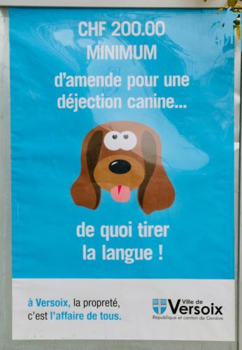 L’affiche est claire. Deux cents balles d’amende et plus si vous ne ramassez pas les déjections de Toutou dans votre jolie cité Versoisienne. C’est salé, autant pour Bijou et Mirza avec leurs petites cro-crottes ridicules que pour les gros moulages de Malouchka et Satanas. La commune a placé de nombreux distributeurs de sacs biodégradables gratuits et à usages multiples (en plus). Profitez-en sans toutefois les jeter n’importe où. (Pour les personnes qui ont des difficultés à collecter le colis peu ragoûtant, il existe des dispositifs de ramassage pas cher sur internet)