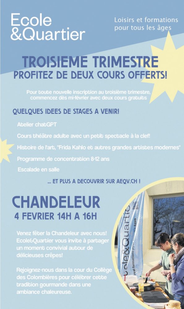 En effet, le lundi 13 avril et le mardi 15 septembre, les personnes domiciliées dans le canton de Genève et en âge AVS peuvent s’inscrire aux animations prévues l’après-midi. Ces activités sont gratuites et un goûter est offert à l’issue de l’évènement. lire la suite...